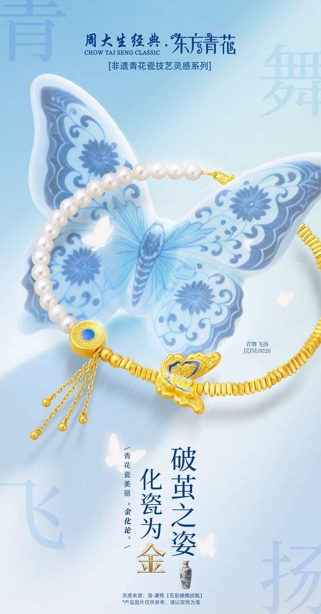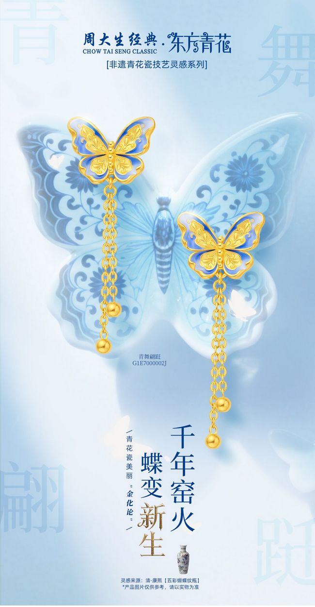 “青舞翩跹”套系灵感源自清代康熙年间 “五彩蝴蝶纹瓶”,借 “蝶” 与“福”的谐音之妙,传递“福泽绵延、美好常伴”的东方祈愿。套系涵盖项链、戒指、耳饰、手链四大品类,以足金勾勒蝴蝶翩跹之姿,青花珐琅点染蝶翼细节,将灵动蝶影凝于方寸之间,实现古典韵味与现代轻盈的完美平衡。