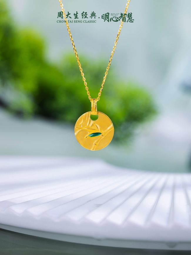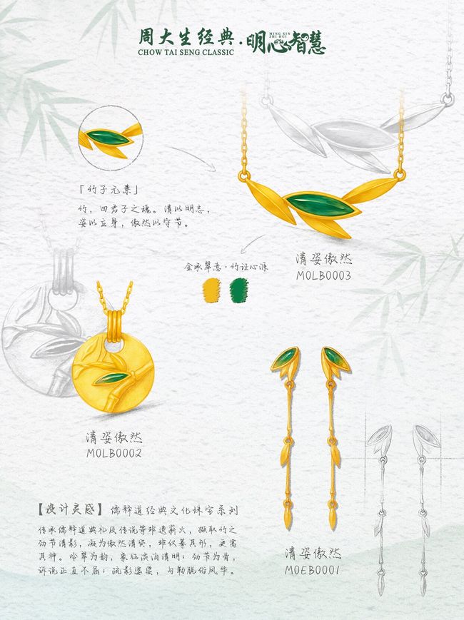 在工艺打造上,套系以写意手法勾勒竹之姿态,依托高精密倒模工艺雕琢细节,叶脉舒展分明、枝节挺拔向上,仿佛风穿竹林之清音婉转耳畔。透色珐琅点缀其间,如晨雾轻笼、朝露凝枝,清逸流转;喷砂工艺赋予金质表面柔光朦胧的质感,恰如师者智慧温润如玉,虽不张扬却足以照亮人心。佩戴“清姿傲然”,既是将君子品格随身相携,更是对师者高尚情操的永恒铭记,让尊师之礼在时光中永续传承。
