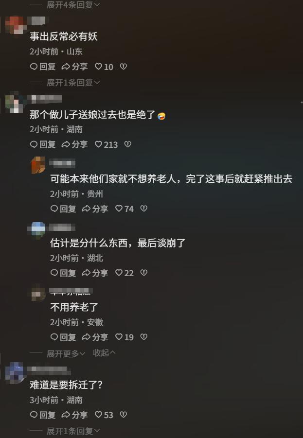 老人的儿子和孙子将老人送去男子家中,却没想到男子母亲却不乐意了,指责他们没资格将老人送到自己这里。