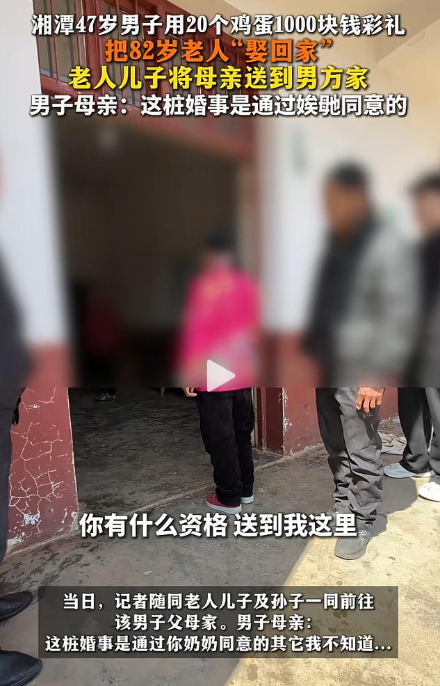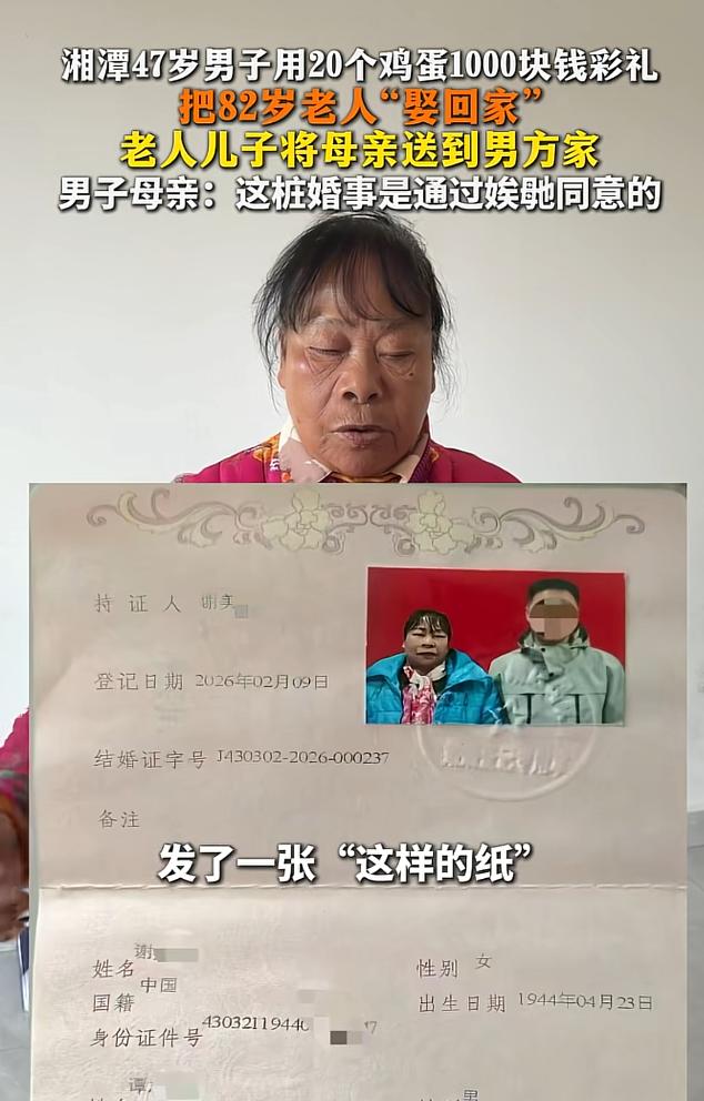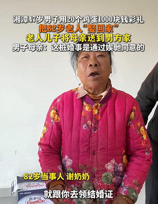 事情发生在近日湖南湘潭,一位47岁的男子突然提着20个鸡蛋和1000块彩礼,来到82岁的谢奶奶家,不说任何原因就要结婚,让谢奶奶跟自己去领结婚证。