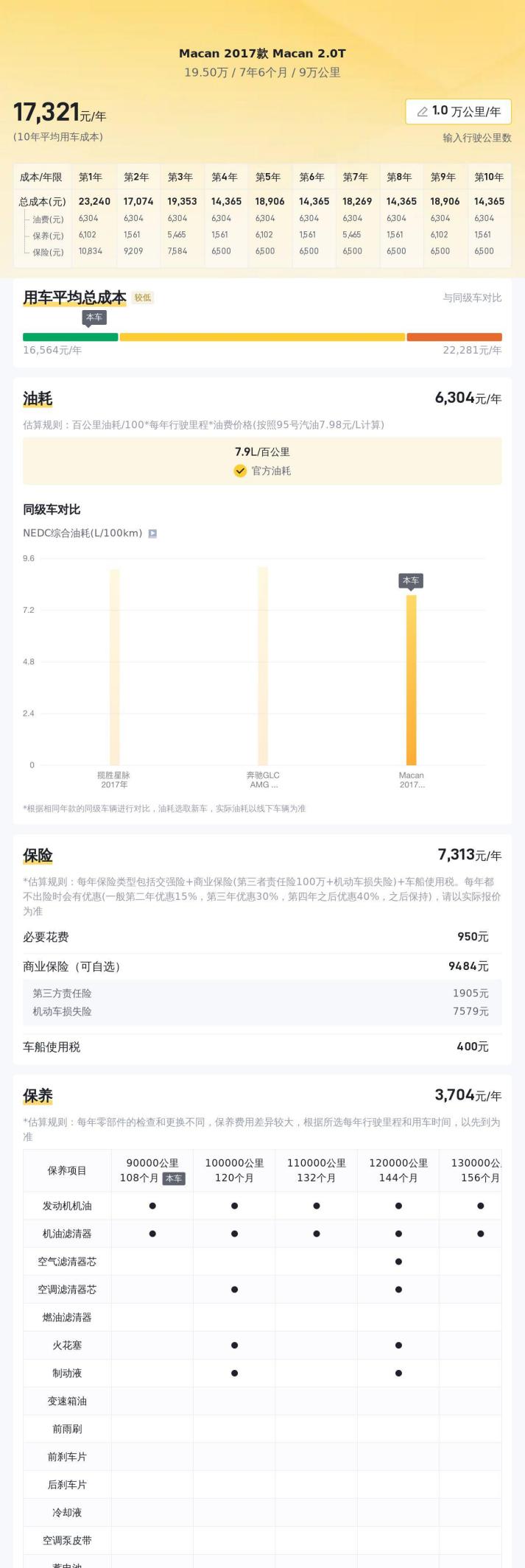 当然,购买二手车,除了关注车辆本身,还要考虑后续的用车成本。根据估算,这辆Macan的年均用车成本大约在1.7万元左右,这其中包括了保险、保养、油费等费用。这对于一辆豪车来说,其实并不算高。