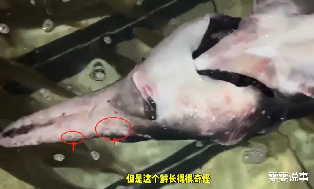 我们来仔细看看鱼类博主@海王弗兰克发出来的照片,图中的怪鱼长着一张很长的嘴巴,和白鲟长长的吻部十分类似。