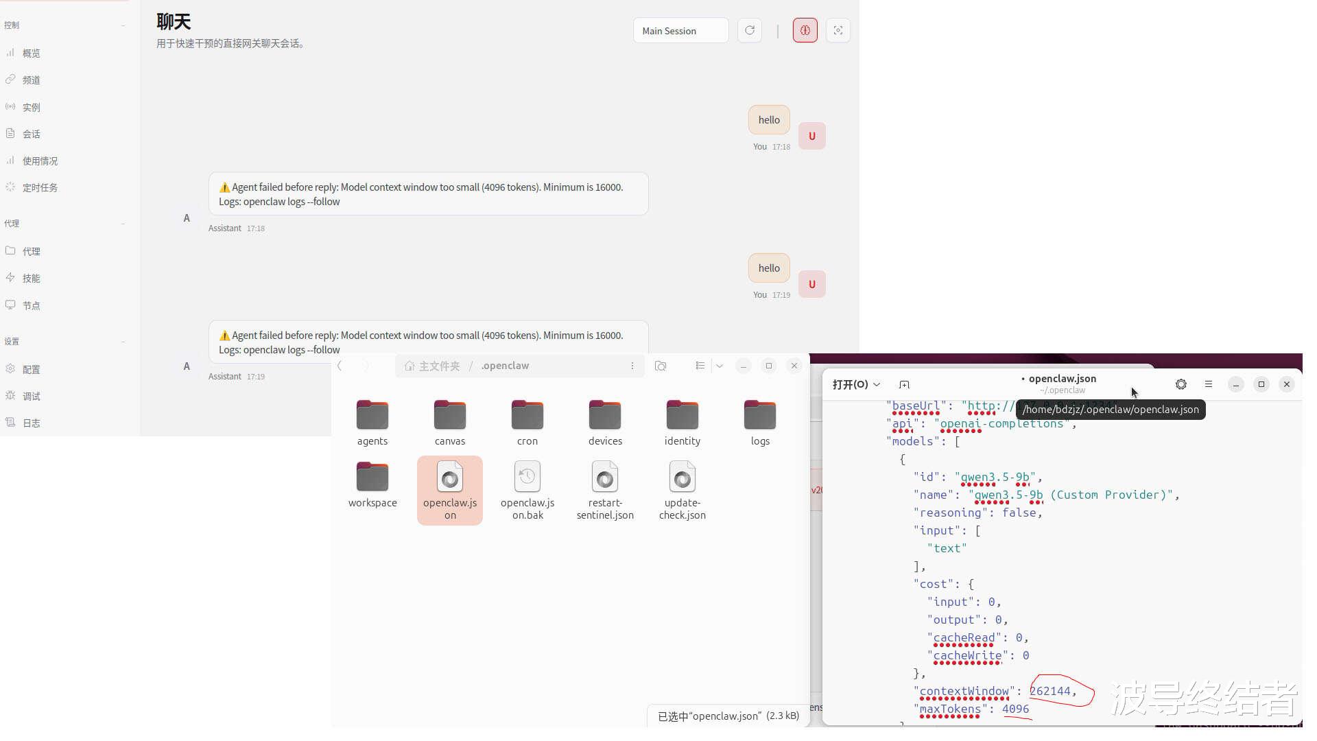 另外,由于我们本地部署模型,算是自定义,有一些参数没有成功同步,还得手动修改,核心就是Token数量。想要跑起来,龙虾提示Token上限至少要为16000,但默认只有4096,我们虽然在LM Studio里改了上限,但没有同步到OpenClaw中,如上图左上。我们找到openclaw.json,打开,找到Tokens相关的两个参数,都改为你模型设置的上限(我这里为262144)。
