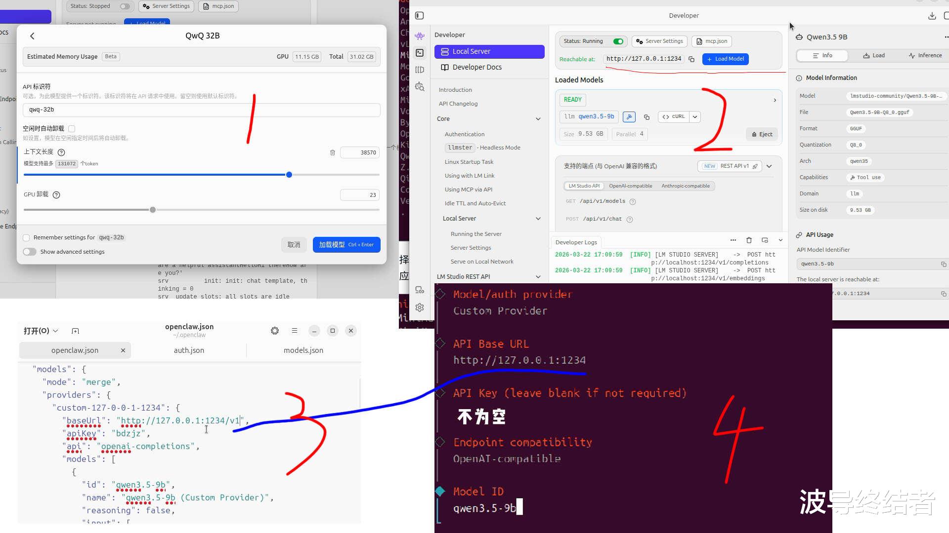 接下来,LM Studio里载入模型,我试了一下手头的Qwen3.5-9b和旧的32B,这里建议大家用Qwen3.5-9b,零刻官方的本地模型也是用的这个。因为OpenClaw对Token要求非常高,增加Token上限将会极大增加内存占用,就算我的H 255机型是32GB内存,也跑不了32B全开。第二,LM Studio打开调试模式,打开局域网调用,见上图2。第三,API Base URL后头有个杠v1,见上图34区别。第四,本地不需要API Key但不能为空,随便填。