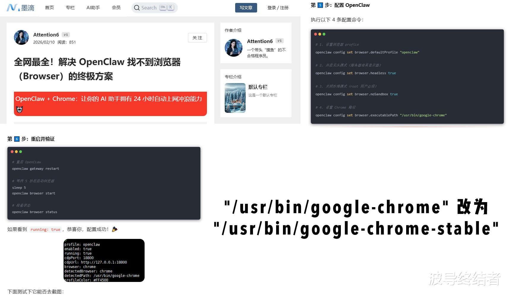 至于接下来,还想让OpenClaw干更多活的话,就看每个人各自的需求了。比如较多人可能需要它帮你查点什么资料之类的,就需要连接浏览器。零刻OpenClaw升级包里只有预装FireFox浏览器,没有Chrome,而OpenClaw目前只能连接Chrome。我参考的是这篇《全网最全!解决 OpenClaw 找不到浏览器(Browser)的终极方案》,再加上自己的一点修改。从下载到安装,里面已经写得很清楚了,但我自己用的时候,必须要把参数里的"/usr/bin/google-chrome" 改为"/usr/bin/google-chrome-stable",才能连接成功。由于ubuntu、OpenClaw、Chrome的版本变动都较为频繁,而且不同环境的情况又不同,仅供参考。