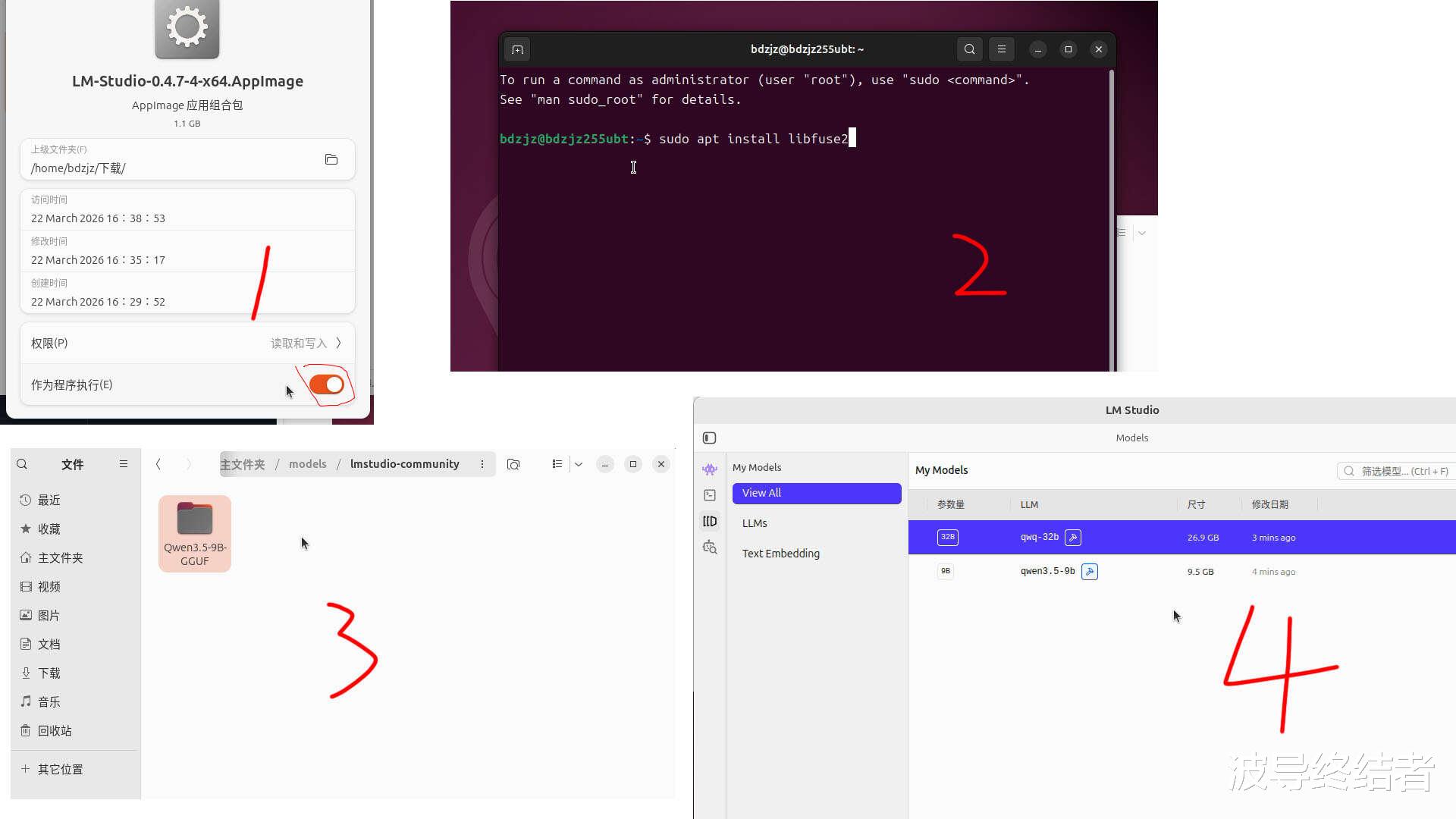 部署的,如果你用ollama或其它,请参考相应的教程。ubuntu/Linux下载得到的是一个Appimage文件,直接运行需要在属性里打开“作为程序执行”的权限,如上图1。第二点,最新版本的的ubuntu缺少库支持,还需要执行sudo apt install libfuse2才能够运行Appimage文件,如上图2。第三,ubuntu下的LM studio模型文件夹需要多一层lmstudio-community文件夹,如上图3。一切OK之后,软件能扫到本地模型,就可以准备下一步了。