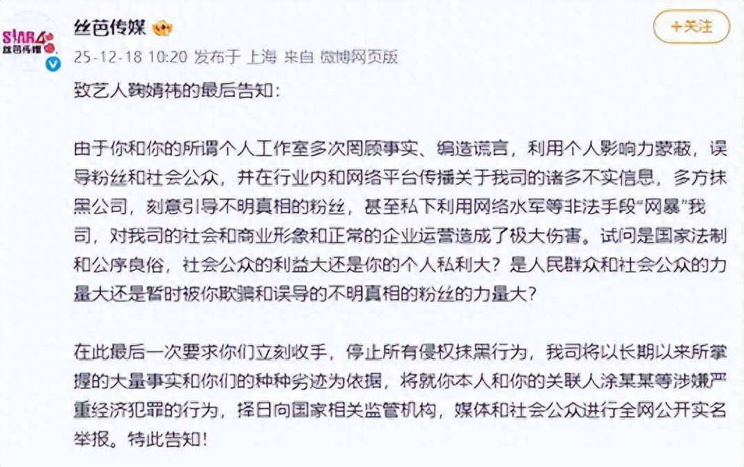 我盯着手机屏幕上弹出的消息时,指尖还残留着刚给艺人补完妆的粉感。“丝芭传媒发最后通牒,鞠婧祎涉嫌严重经济犯罪,择日全网实名举报”,短短一行字,像颗炸雷在我这个娱乐圈小助理的朋友圈里炸开了锅。