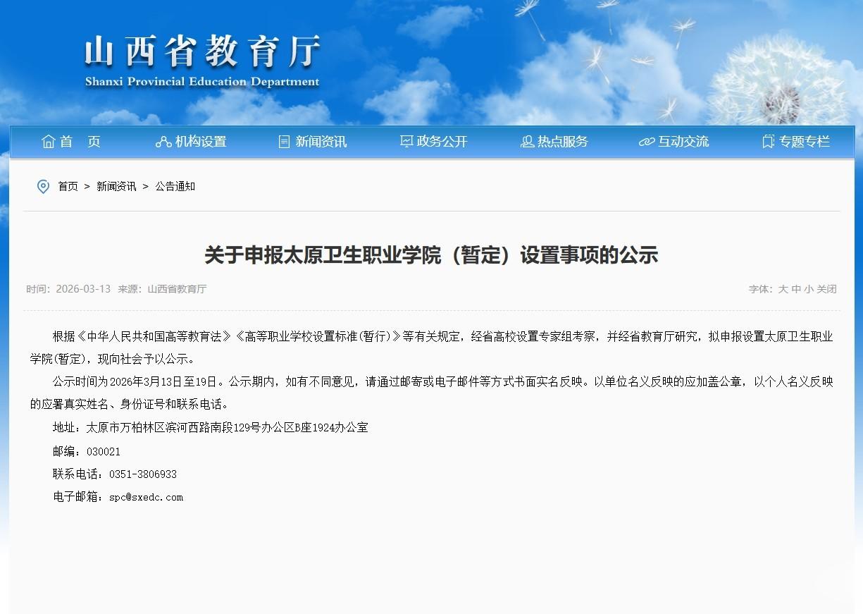 近日,山西省教育厅发布《关于申报太原卫生职业学院(暂定)设置事项的公示》,根据有关法律法规规定,经省高校设置专家组考察和省教育厅研究,拟申报设置太原卫生职业学院(暂定)。这意味着又一所新的省会大学即将设立。