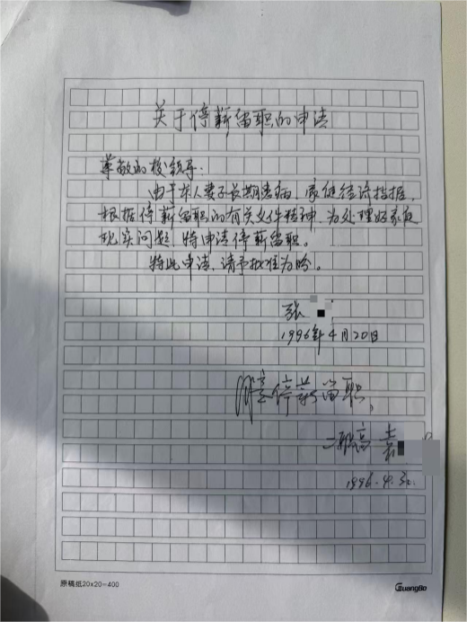 (停薪留职申请,张老师提供)