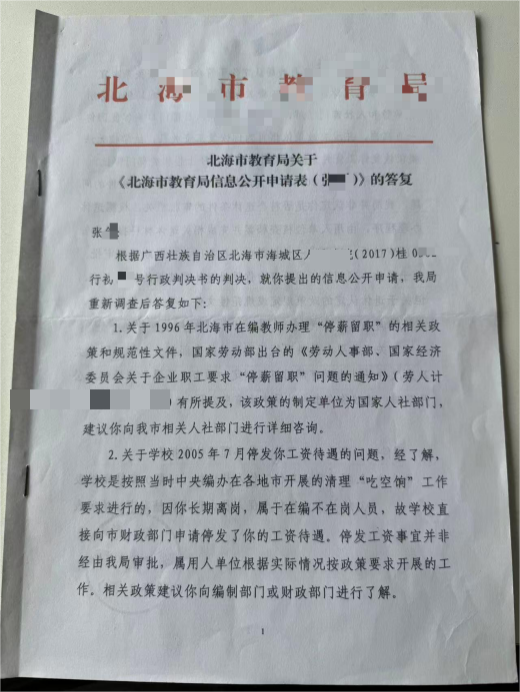 1996年,张老师因妻子患尿毒症需巨额医疗费,恰逢当时“下海”潮,又响应学校号召,提交了书面停薪留职申请。时任北海市第二职业高中(后合并为现职校)校长袁某林批准申请,双方口头约定“学校通知即返岗”,却未签订书面协议。张老师后续申诉指出,学校拒签协议实为截留工资“吃空饷”,这一说法得到多重佐证:北海市人社单位函件显示,其工资至2005年7月才停发,远超停薪留职政策规定的“批准即停薪”时限;2014年学校出具的《情况说明》,也确认因其一事批准停薪留职、2005年停发工资的事实,而法院对原校长的询问笔录,也清晰记录了当时批准停薪留职的全过程。