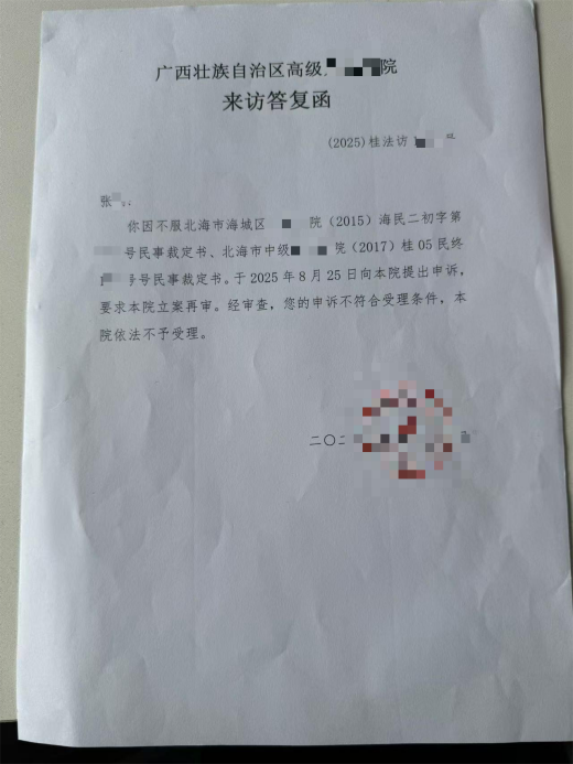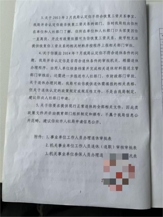 权益维护之路异常艰难。2015年,张老师申请劳动仲裁及民事诉讼均被驳回,理由为“不属法院受理范围”;2025年他委托律师向广西高院申诉,仍收到“不予受理”的答复。2017年,他申请公开拒退依据,遭教育单位以“非本单位制定”拒绝。各个单位相互转介,均未主动担责,即便教育单位负责人坦言其问题属历史遗留,也未给出解决方案。针对张老师提出的“依据哪条法律剥夺退休权”“为何变更编内身份”等核心质疑,各部门始终回避,未给出明确回应。