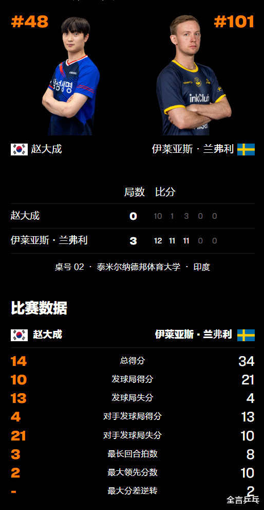2026年2月13日,乒乓球WTT印度金奈球星赛再爆冷门,曾打败过国乒大满贯樊振东的韩国主力赵大成0-3惨败被横扫,不敌世界排名仅101位的瑞典老将兰弗利(29岁),而且单局只拿到1分崩溃,由此而一轮游止步男单32强,详细战况请看下文。