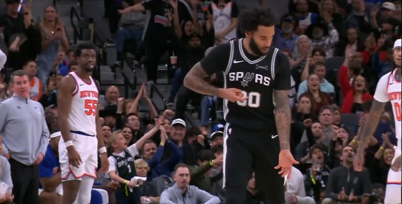 第四节刚开始,文班亚马腿部略感不适,被换下,镜头下的他一瘸一拐回到了更衣室。尼克斯趁机扩大优势,分差来到两位数,马刺叫了暂停。