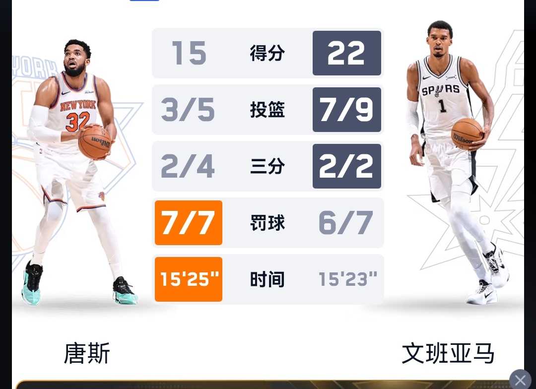 值得一提的是。本赛季上月17号的杯赛决赛中,两队有过一次交锋。夺冠大热的马刺113-124负于尼克斯,将冠军拱手相让。决赛中,马刺头号得分手文班亚马替补出场得到18分。