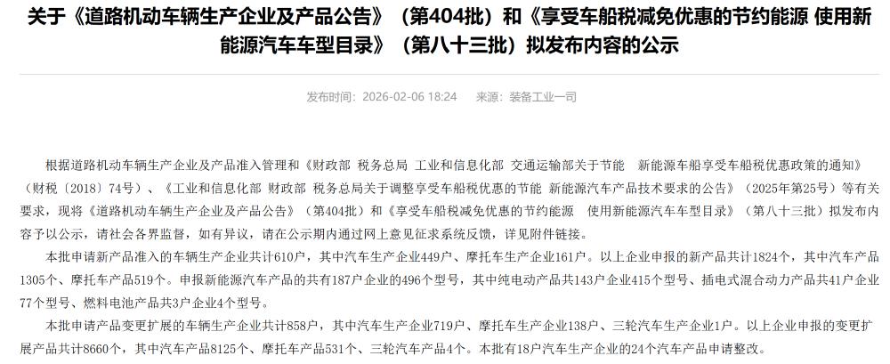 工信部发布第404批《道路机动车辆生产企业及产品公告》