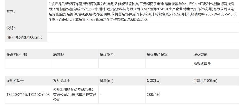一、小米YU7 GT搭载双电机 总马力约1003匹小米又一款新车来了,一款尾标为“小米YU7 GT”的车型出现在了此次工信部公示信息中。