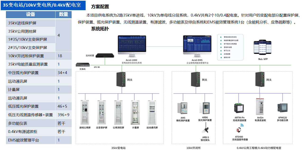 本项目需要配套一套变电站综自系统实现35kV变电站本地监控管理,包含保护装置、保护屏、弧光保护装置、无线测温装置、综自系统等,保障园区可靠用电;同时需要配置一套园区综合能效管理系统实现从35kV变电站到各个分配电室能量流上的电力监控、电能质量治理、电能管理、能效分析、应急照明与疏散指示等功能。
