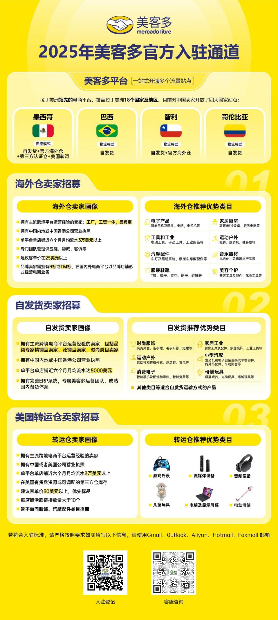 美客多2025新卖家画像2025年美客多鼓励卖家同时开启海外仓和自发货业务,最大化您在拉美4大市场(墨西哥、巴西、智利、哥伦比亚)的销售产出。主要为以下模式: