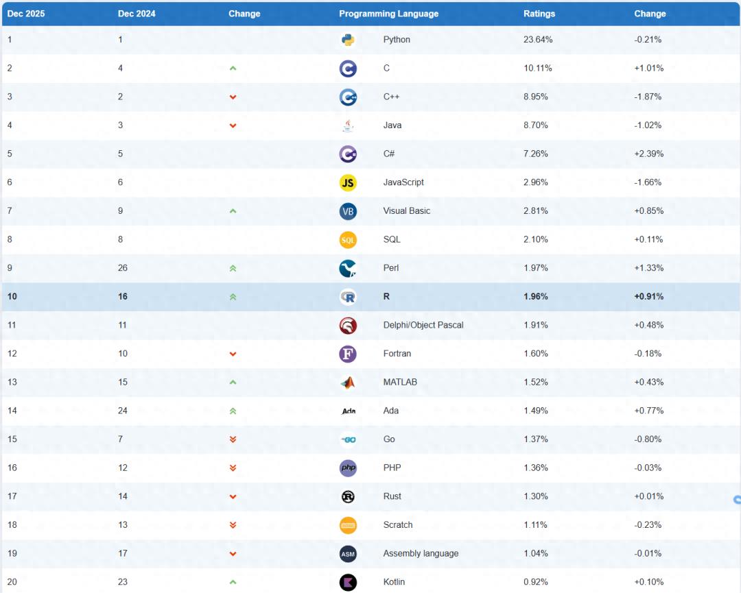 到现在整个市场都占比竟然连 10%都不到了,到如今这里面最大的王者就是 Python 了,特别是这些年在 AI 的加持下。