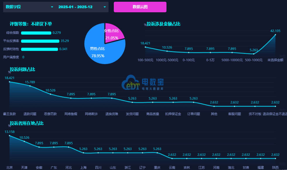据网经社旗下电商大数据库“电数宝”监测数据显示,2025年全年“微拍堂”还疑似存在霸王条款、退款问题、恶意罚款、网络售假、商品质量、扣押保证金、网络欺诈、订单问题、退换货难、发货问题、售后服务、货不对板等问题。其中霸王条款占比最高,达到了约18.4%。