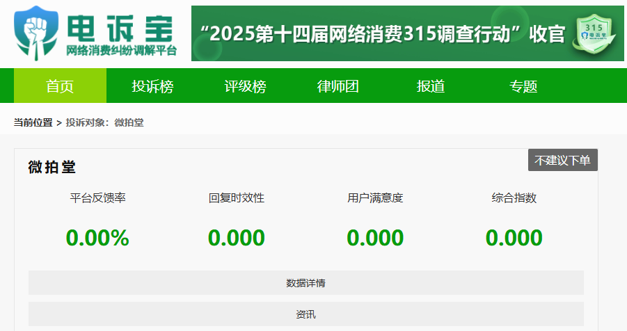 2024年至今,根据“电诉宝”受理的数字零售中文玩电商领域用户有效投诉显示(依据投诉量排行),“微拍堂”排名第1位。最新评级为“不建议下单”。 除此之外,其他被投诉的类似平台还有:艺狐在线、古泉园地。