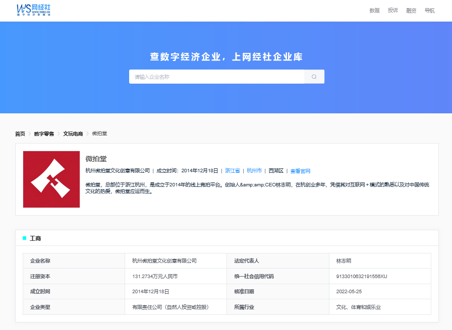据网经社企业库显示,“微拍堂”属于杭州微拍堂文化创意有限公司,成立于2014年12月18日,法定代表人为林志明。