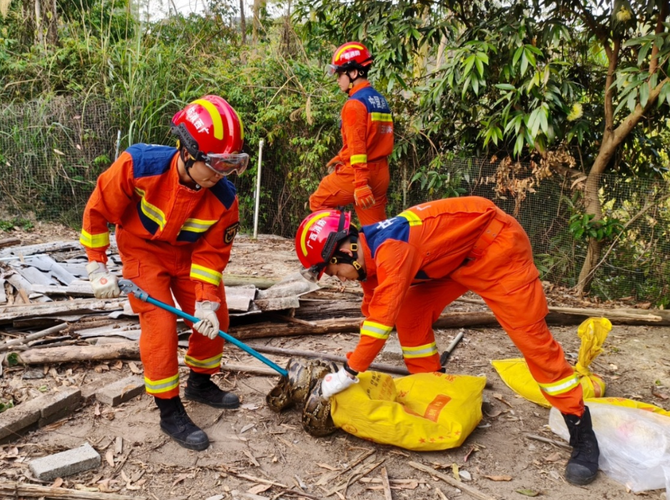 4月15日午后,玉林博白县文地镇中良村突发惊险一幕:消防救援人员在处置村民报警的"大蛇出没"警情时,意外端掉一个隐藏在废弃猪场内的蟒蛇巢穴。当救援人员用捕蛇钳探入杂物堆时,发现6条成年蟒蛇交错盘踞,其中最重个体达50斤,与成年人小腿相当。