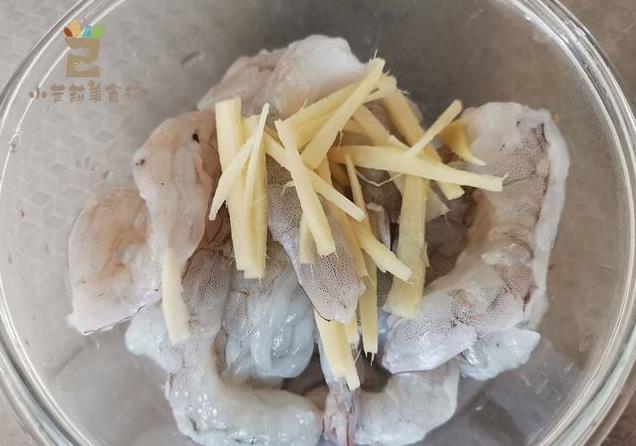 1、新鲜的虾营养更足,味道也要鲜很多,逐一去掉外壳,清理干净,加点姜丝腌制待用。
