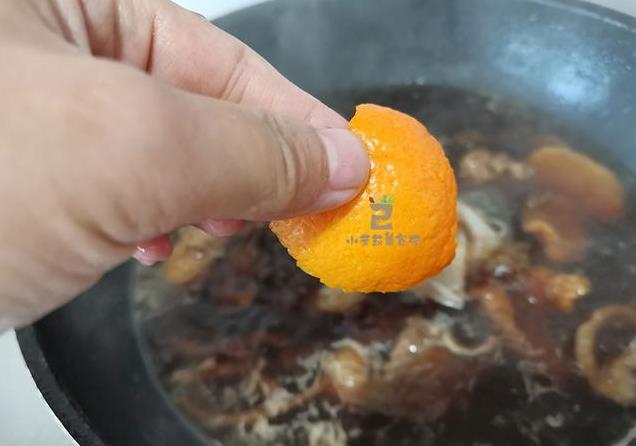 4、锅里加满水,丢一块橘子皮进去,调成小小火,咕嘟两个钟头,肉质纤维变软。