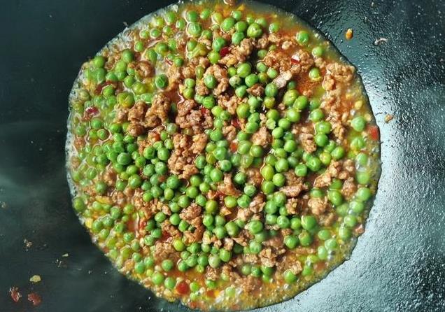 4、豌豆下锅,补一点生抽,蚝油,两勺热水,继续焖两分钟。豆和肉都入味后,即可装盘。