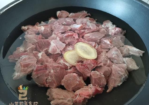 2、牛肉倒进宽水里,丢两片生姜进去,之后开火加热,逐渐煮出浮沫,待肉质彻底变色以后,逐一捞出控干。