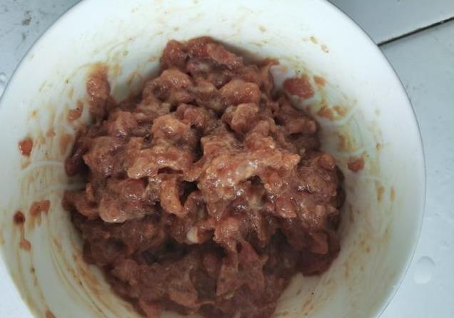 2、一点瘦肉剁成颗粒状,加点生抽,白胡椒,淀粉,油,搅拌匀。