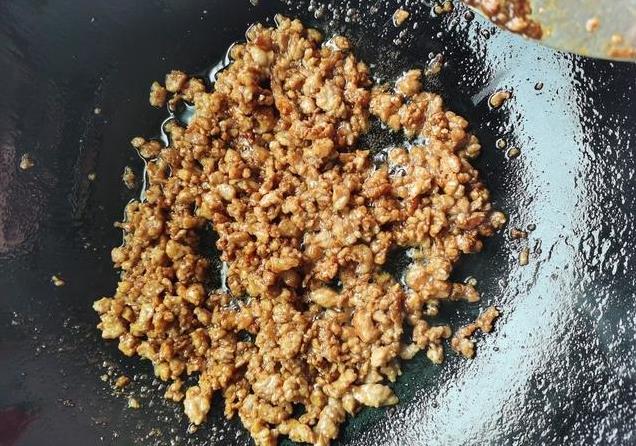 3、锅中放油烧热,肉倒进去,扒拉散,继续炒到粒粒断生。