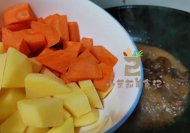 5、胡萝卜和土豆各来一块,倒进锅里,补点盐,继续用小火咕嘟十五分钟,之后就可以关火了。
