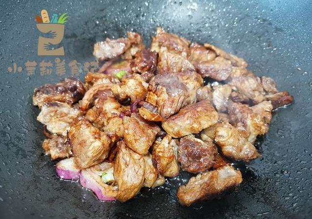3、正式炖之前要先炒一炒,油少许烧热,肉和洋葱,姜片一起下锅,反复煸炒,直到肉质紧缩,油脂的部分析出,这时候加一把冰糖,一点酱油,两三下扒拉上色。