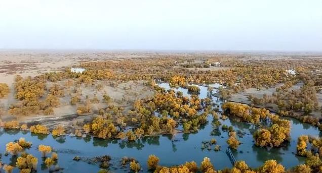 随着湖水的不断注入,台特玛湖周边的生态系统也在逐步恢复。胡杨林重新焕发出勃勃生机,金黄色的树叶在微风中轻轻摆动,它们的根系深深地扎根于土壤之中,发挥着防风固沙的重要作用。