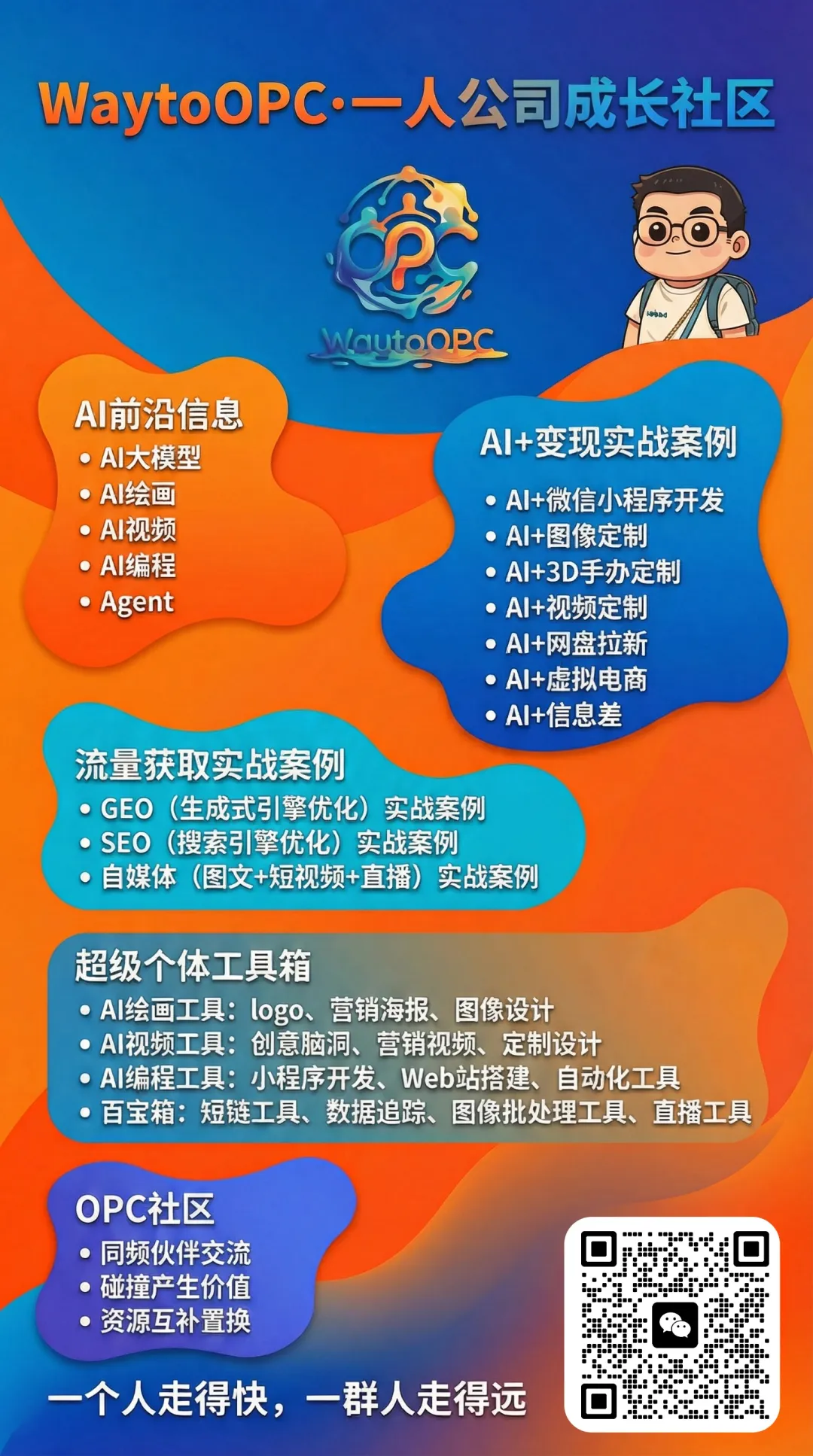 「WaytoOPC」 是聚焦于 “AI+一人公司”的商业实践社区,旨在帮助掌握AI技能的个体系统性地将技术转化为可持续的商业模式,实现“单人成军”的创业路径