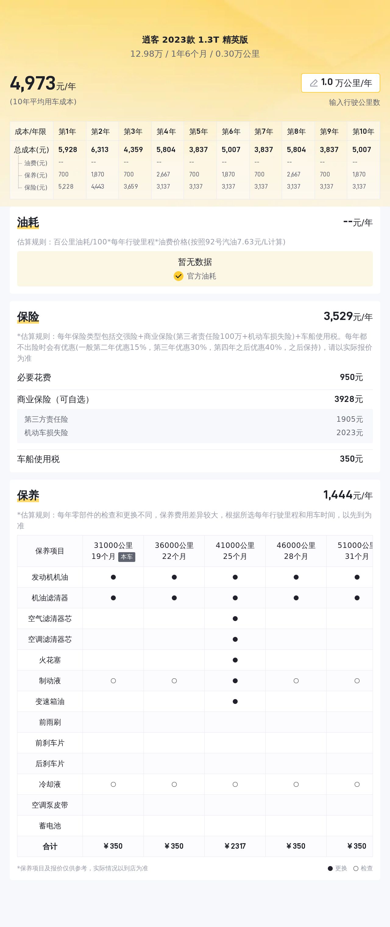 年度用车成本也是每个车主必须考虑的因素。根据不同车主的实际使用情况,每年的开支会有所差异。下面我们将展示该车型的平均用车成本,为您提供参考。