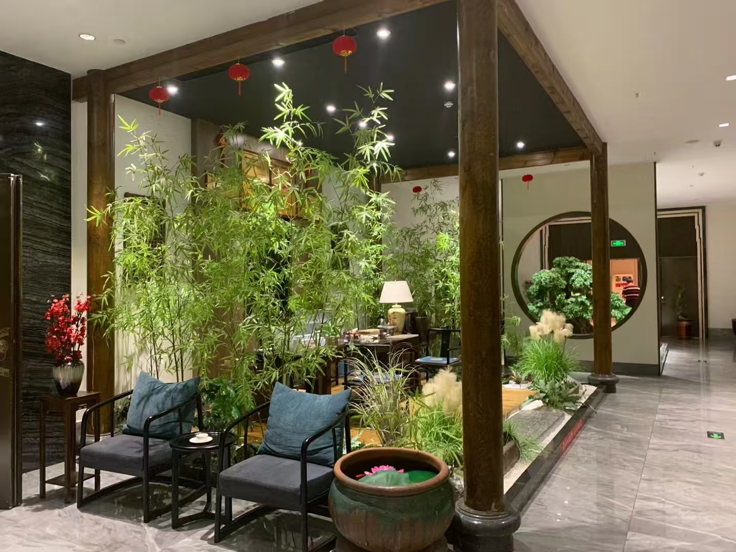 这里有假山,假山下有一大片水潭,水潭中养着数十条大大小小的金鱼。看到正前方有一处古雅亭子,周围长得茂盛的草,有许多竹子,碎石子铺成的小路幽静无比。