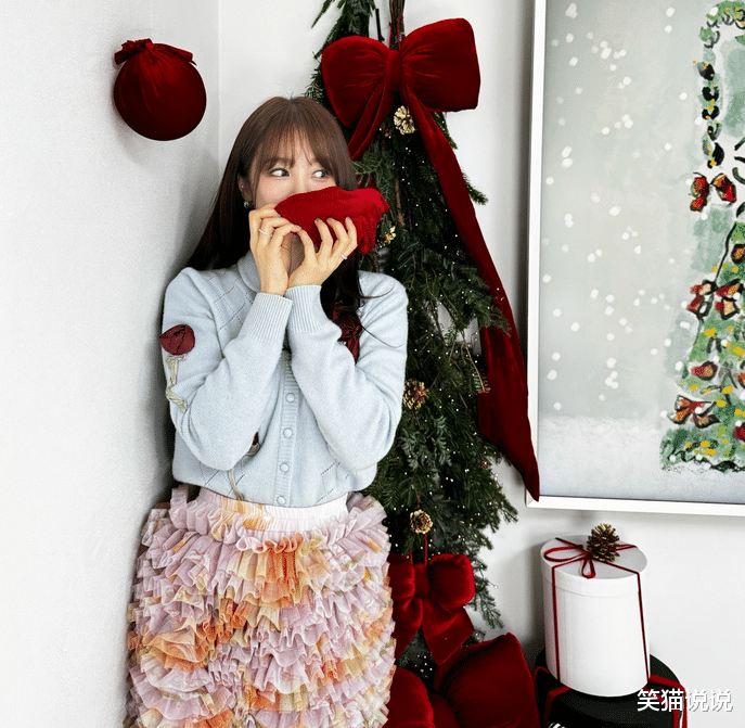 尹恩惠还晒出了另外一套不同风格打扮的圣诞节系列照片。照片中的她穿着淡蓝色的长袖针织衫外套,搭配紧身的褶皱花纹半身裙与白色的长袜,看起来有些搞怪。
