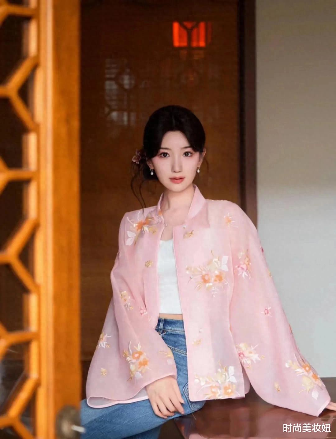 新中式风格讲究色彩的和谐统一,可以选择低饱和度的颜色进行搭配,例如粉色、蓝色、米色等,避免过于艳丽的色彩。毛晓彤搭配的这条浅蓝色的牛仔裤,粉+蓝是高级感的配色,不仅突出新中式的魅力,又增加了时尚度,而且还很减龄,这种搭配适合所有年龄段的人,甜美又温柔。