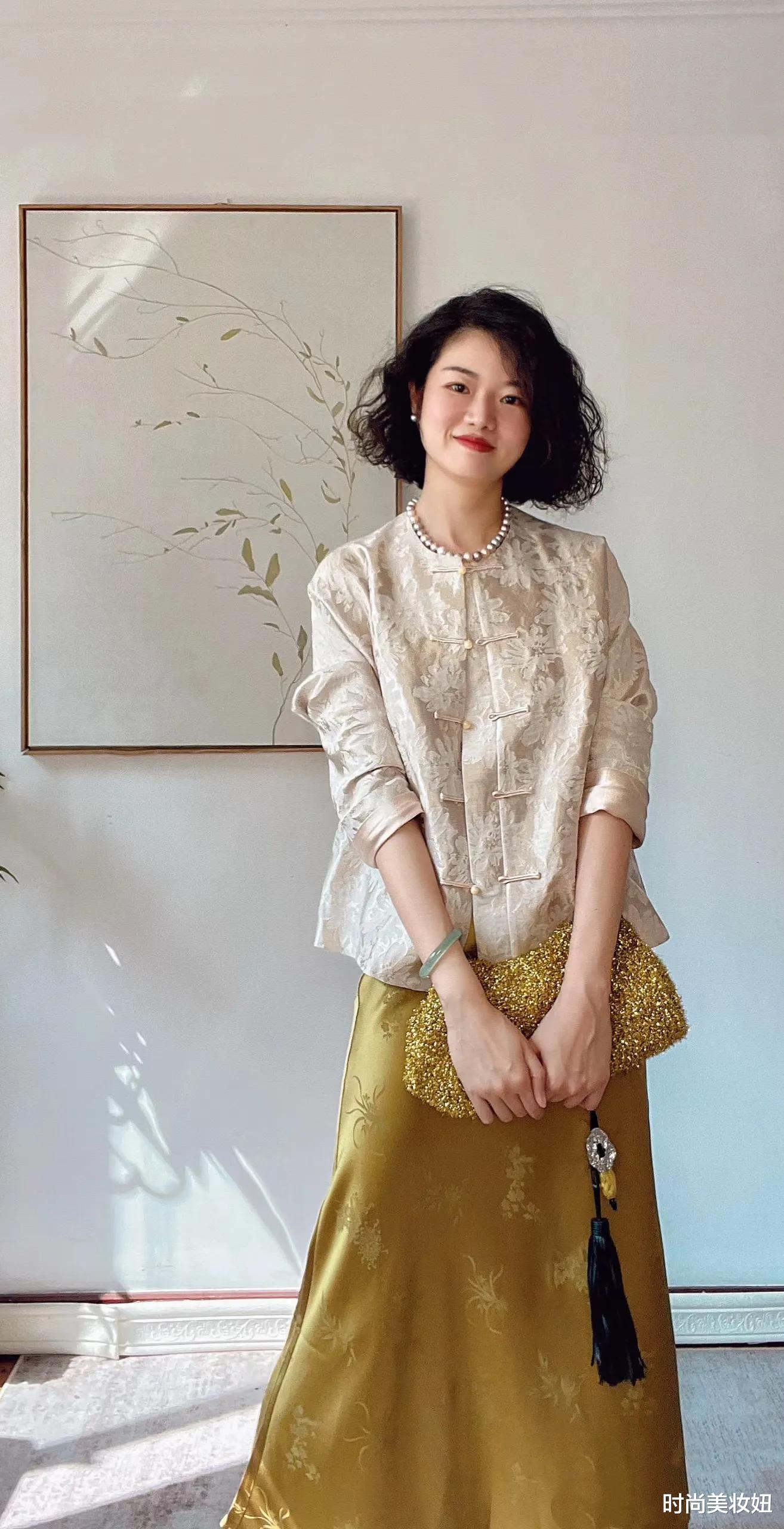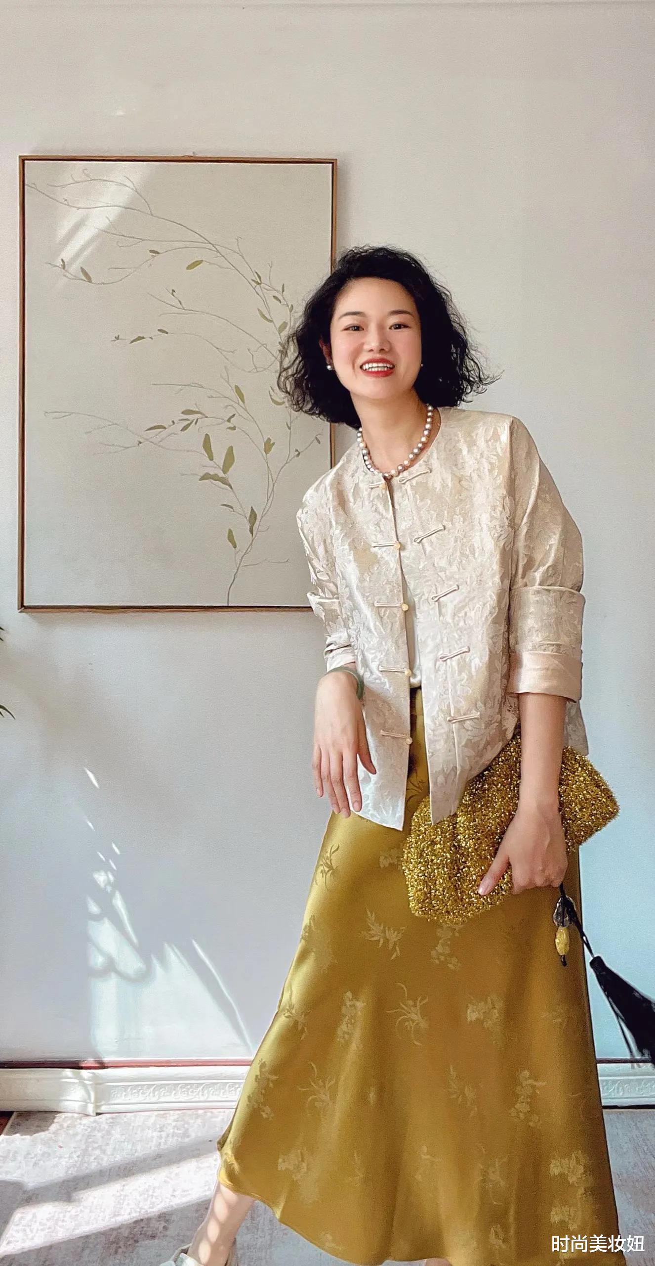 米杏色新中式上衣与金色醋酸半身裙的组合,瞬间将贵气与优雅拉满。米杏色的柔和与金色的华丽相得益彰,新中式上衣的立领、盘扣或刺绣细节,赋予整体造型古典韵味,而金色醋酸半身裙的光泽感则增添了现代摩登气息。搭配一条精致的珍珠项链,不仅提亮了整体色调,更让贵气感扑面而来。鞋子可以选择一双裸色尖头高跟鞋,拉长腿部线条的同时,保持整体的高级感。这样的搭配非常适合晚宴、派对或重要场合,既彰显品位,又充满东方女性的温婉与大气。