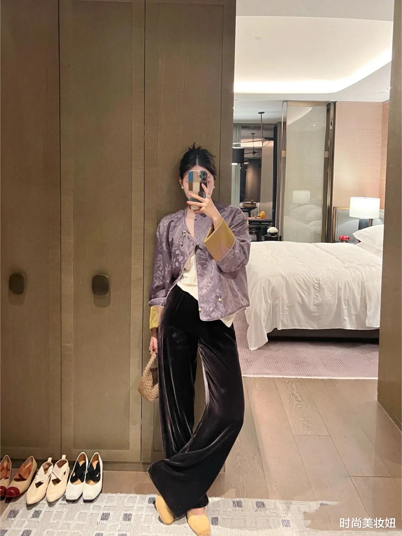 香芋紫新中式上衣与黑色丝绒裤的搭配,既高级又充满时尚感,洋气十足!香芋紫的温柔与浪漫,搭配新中式设计的立领、盘扣或刺绣元素,展现出独特的东方美学。而黑色丝绒裤的质感与垂坠感,不仅显瘦显高,还为整体造型增添了一抹低调的奢华。鞋子可以选择一双黑色尖头高跟鞋或短靴,进一步提升气场。配饰上,可以搭配简约的金色耳环或一条细链项链,让整体造型更加精致。这样的搭配既适合日常出街,也能轻松驾驭约会或晚宴场合,时髦又高级!