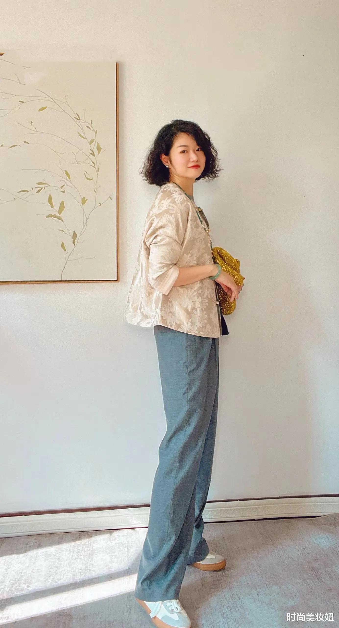 米杏色与灰色的搭配,低调中透着高级感,新中式元素与西装裤的结合更是将古典与现代完美融合。选择一件米杏色的新中式上衣,立领、盘扣或斜襟设计点缀其中,既保留了东方韵味,又显得优雅知性。下身搭配一条垂坠感十足的灰色西装裤,利落的剪裁与宽松的版型让整体造型既大气又舒适。鞋子可以选择一双浅色系的乐福鞋或尖头平底鞋,增添一丝干练气质。这种搭配不仅适合职场通勤,也能轻松驾驭日常约会或正式场合,展现出从容不迫的高级感。