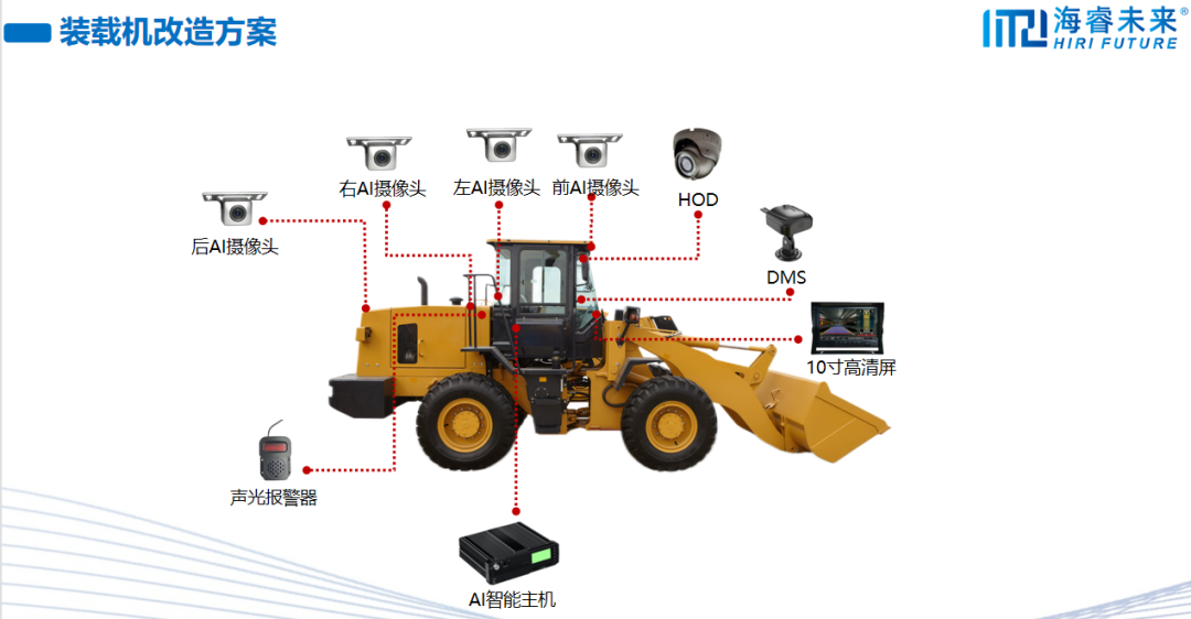 传统流机作业依赖司机肉眼观察和经验判断,在盲区多、环境杂、反应时间短的工况下,难免存在安全隐患。海睿未来推出的流机AI预警及智能防撞系统,构建了一套“端-边-云”协同、数据驱动的智能安全防控体系。