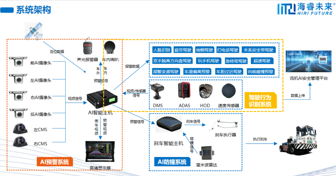 该方案以人工智能为核心,融合物联网与工业控制技术,通过前端智能感知设备实时采集车辆状态、司机行为与周边环境数据,并上传至云端智能安全监管平台,实现从实时预警、行为分析、风险干预到数据复盘的全流程闭环管理。系统具备身份认证、盲区全景环视、驾驶行为监测、碰撞预警及智能辅助刹车等功能。