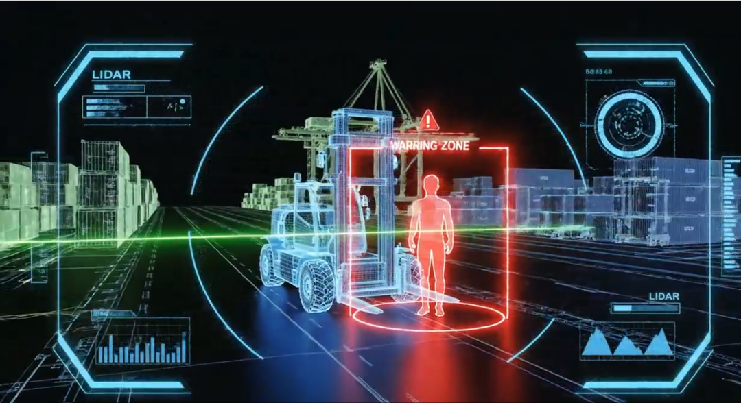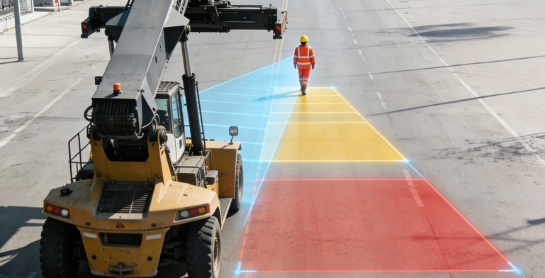 区别于依赖固定停止距离的传统防撞方案,海睿未来AI防撞系统可在流机行进范围内,实时规划并监测虚拟安全区域,精准识别人员、车辆、设备等多类目标,并依据实时车速、相对距离与运动状态等数据,动态设定分级的减速区与制动区,实现不同方向上的定制化防护策略。