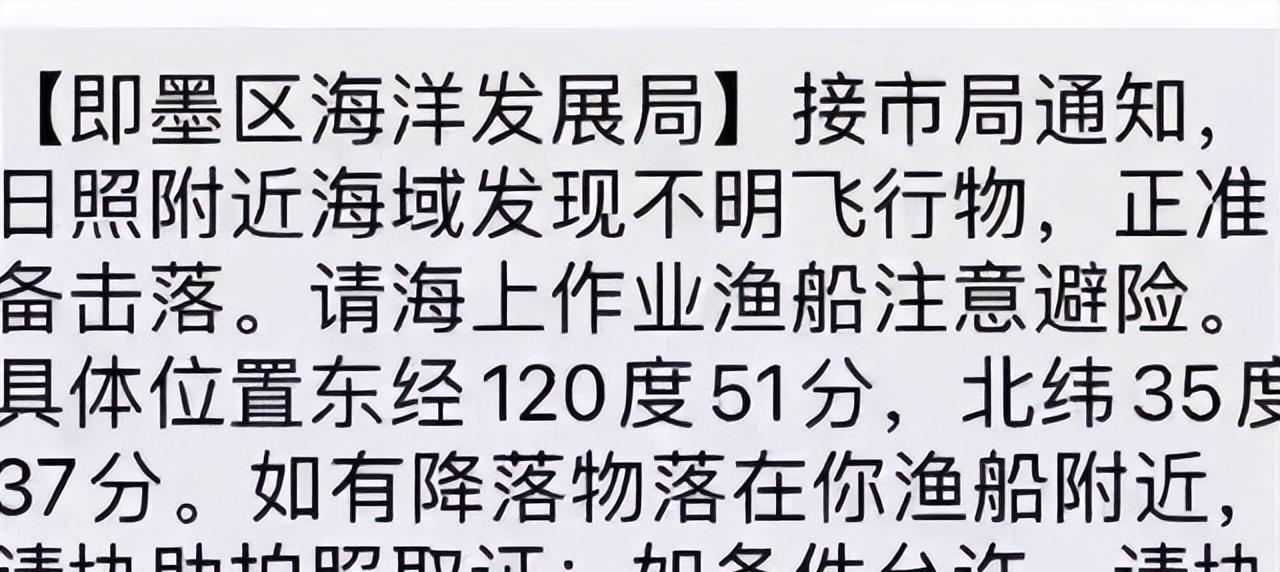 2月12日,山东青岛即墨区海洋发展局发了一个通知:日照附近海域发现不明飞行物,正准备击落,请海上作业渔船注意避险。还特意提了一句:如果降落物落在你渔船附近,请协助拍照取证;如果条件允许,请协助打捞。