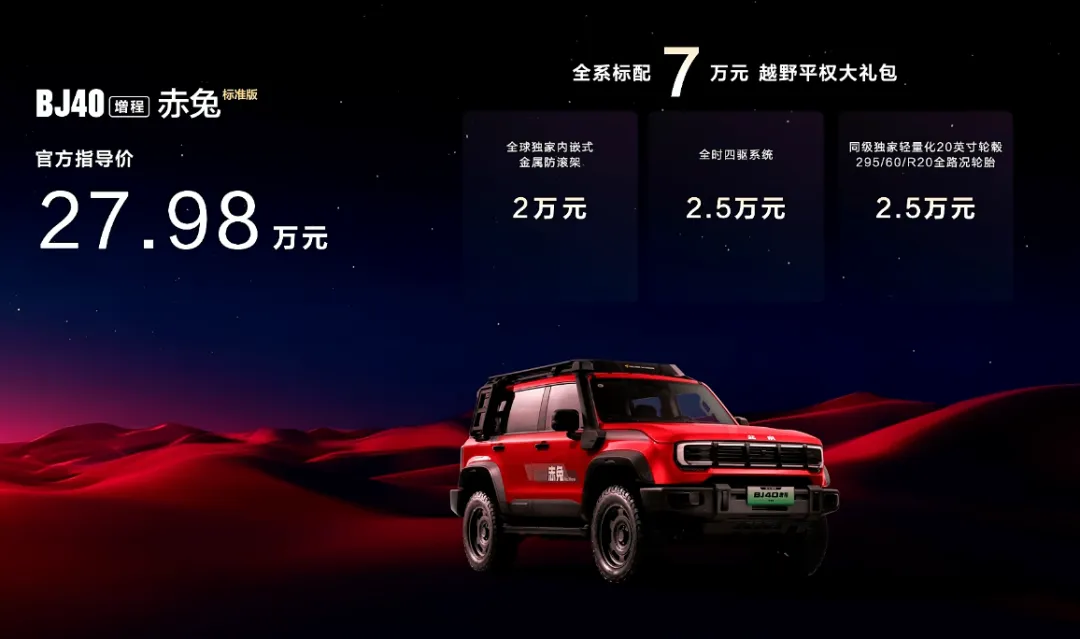 1月27日,北京越野举行BJ40新车发布会暨中国大环线启动盛典,活动上,北京越野官宣了中国大环线启动,同时北京越野BJ40三车齐发,其中,BJ40增程赤兔交付,该车售价:27.98万元,且三电终身质保。BJ40燃油巨幕版上市,综合焕新价:13.29万元-14.39万元。BJ40增程悦野飞行版预售,价格为:24.78万元。北京越野BJ40热销,增程、燃油双动力均受到市场好评,此外新车还推出了多重金融政策,具体如下图。作为现款增程版的进阶车型,新车聚焦越野核心硬件升级,未对外观大幅改动,原厂标配高位涉水喉、氮气减振器、全地形AT轮胎,直接具备中度越野能力,省去用户后期改装成本。