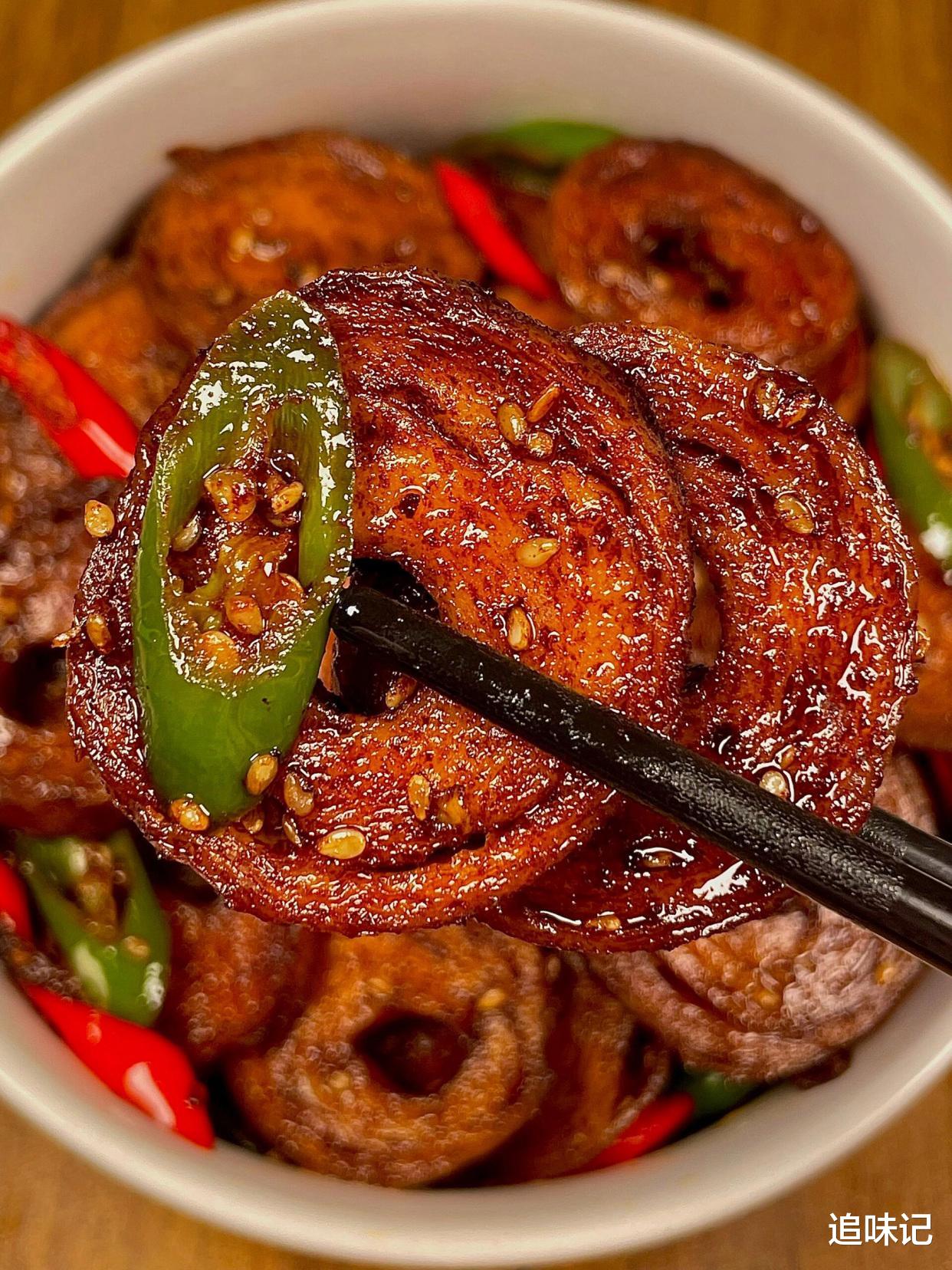 辣炒面筋面筋外焦里嫩,吸满了香辣酱汁,辣味十足还带着芝麻的香气,每一口都特别过瘾,青红椒的加入让口感更丰富。